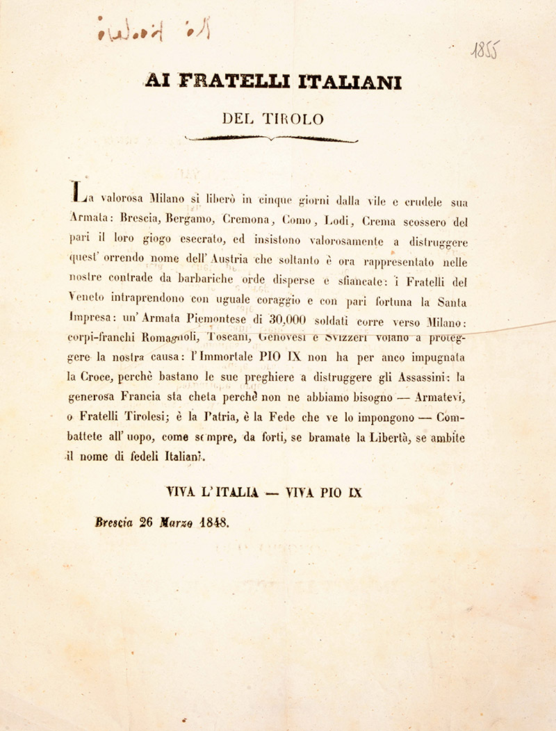 Esortazione del Governo provvisorio di Brescia al popolo del Tirolo ad insorgere, 26 marzo 1848