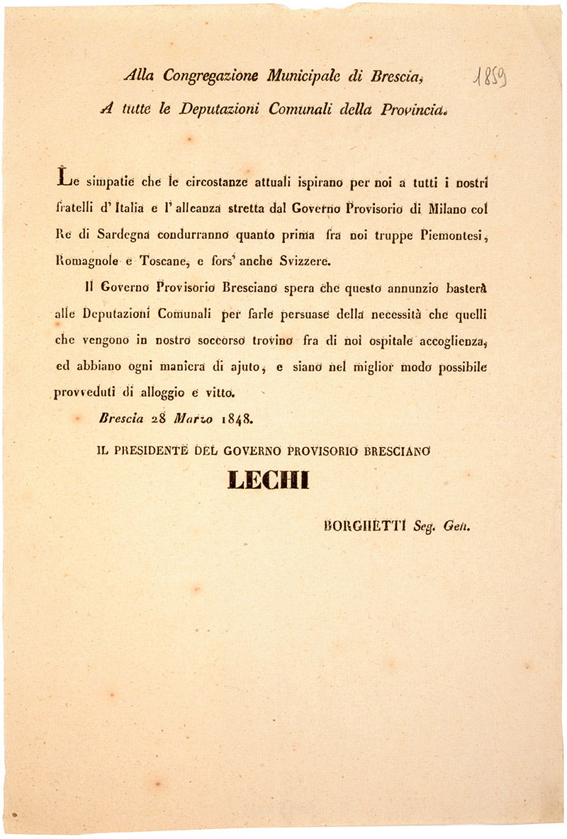 Esortazione del Governo provvisorio di Brescia alla congregazione municipale e alle deputazioni provinciali ad accogliere le truppe alleate, 28 marzo 1848