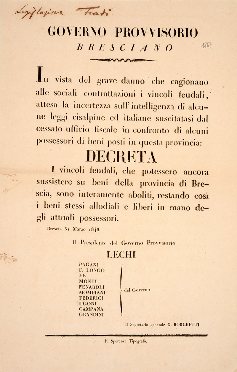 Decreto del Governo provvisorio di Brescia di abolizione dei vincoli feudali, 31 marzo 1848