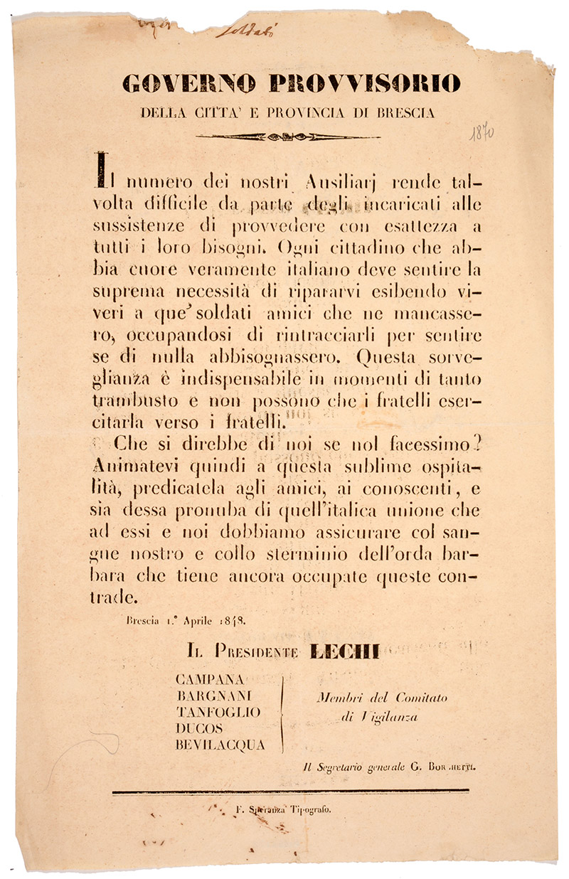 Invito del Governo provvisorio di Brescia ai cittadini a provvedere ai bisogni dei soldati alleati, 1 aprile 1848